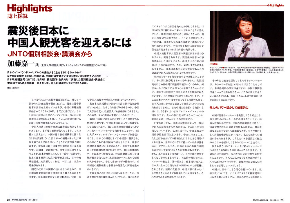 東日本大震災後に在日中国人が帰国してしまった背景、 そして”中国人が興味をもつ日本”に関する記事が3ページにわたり取り上げられています。